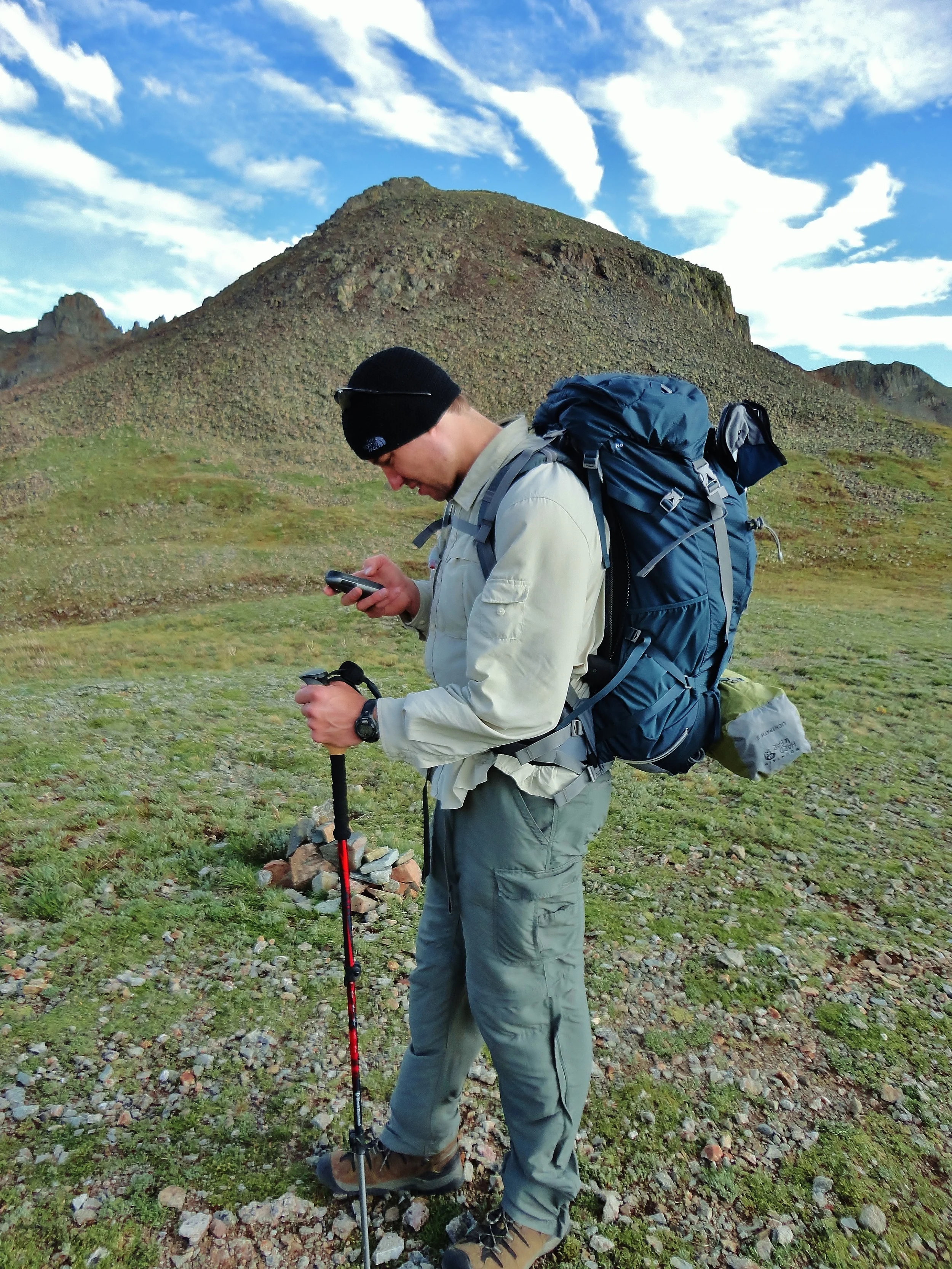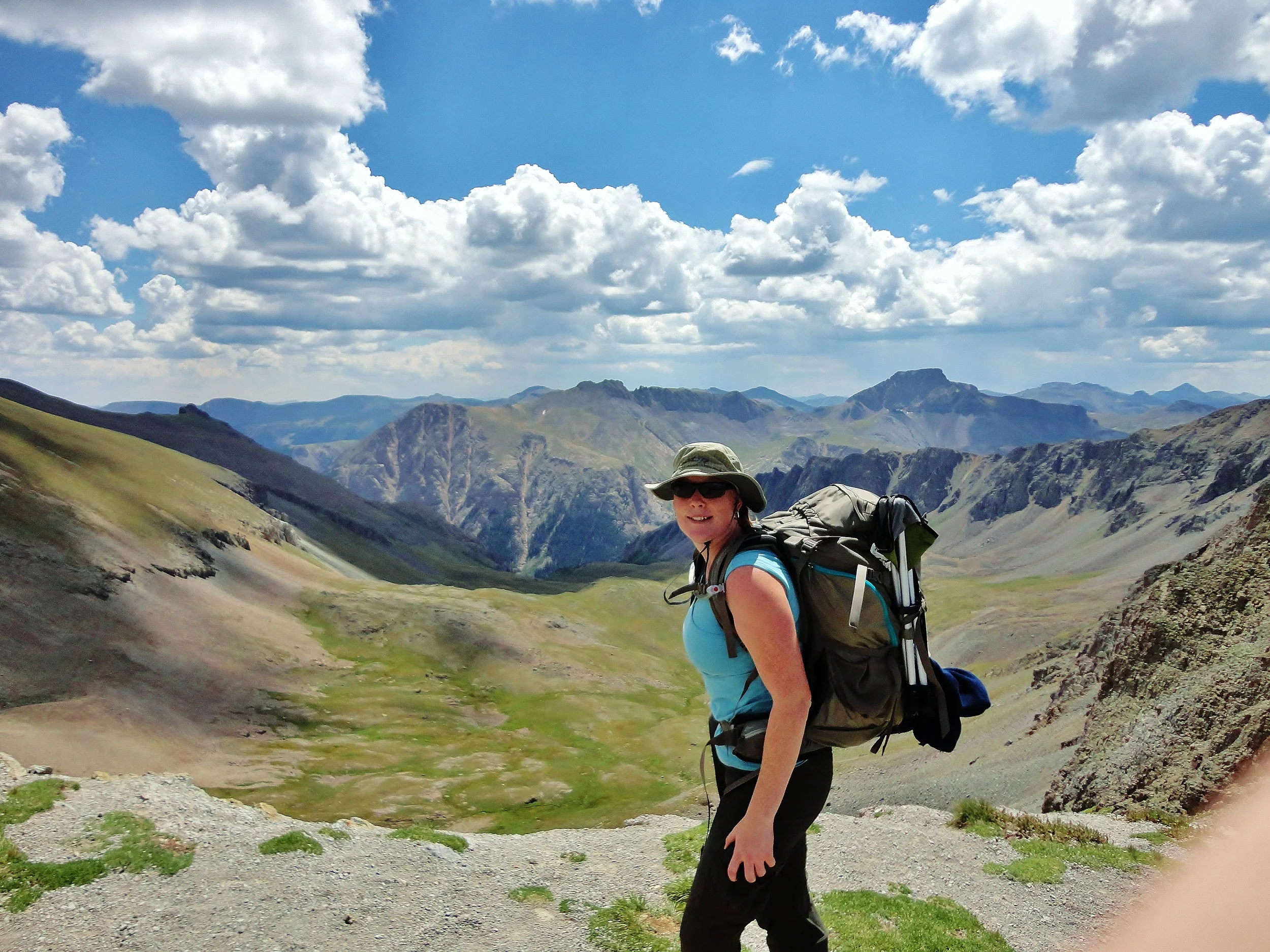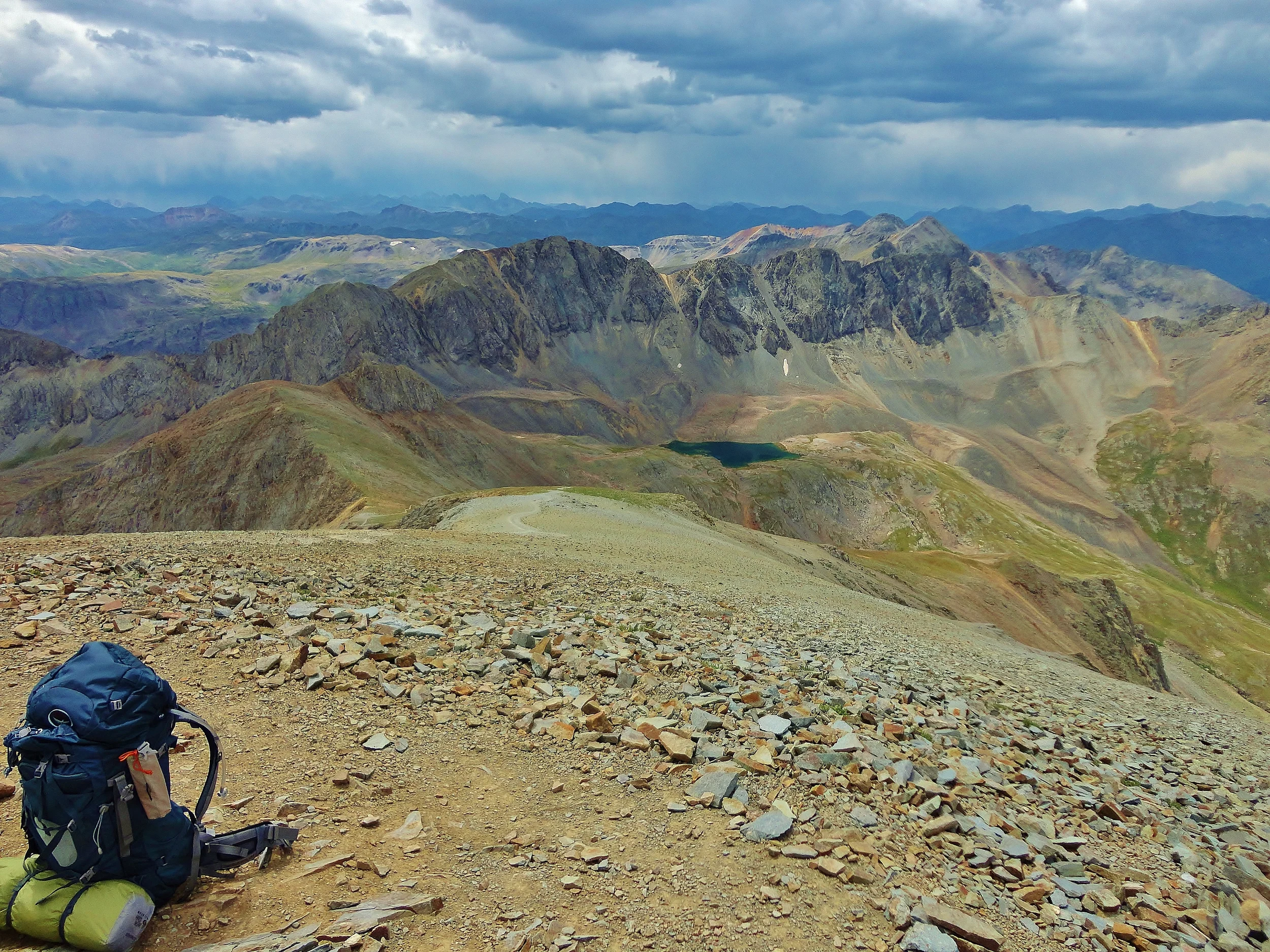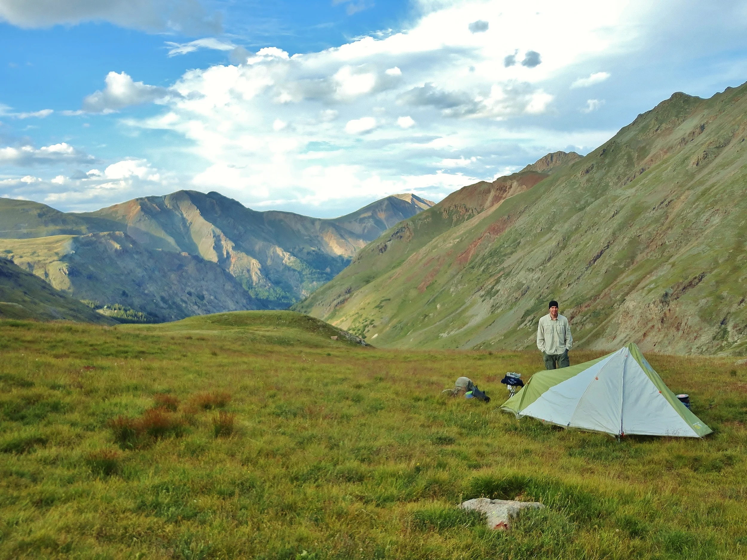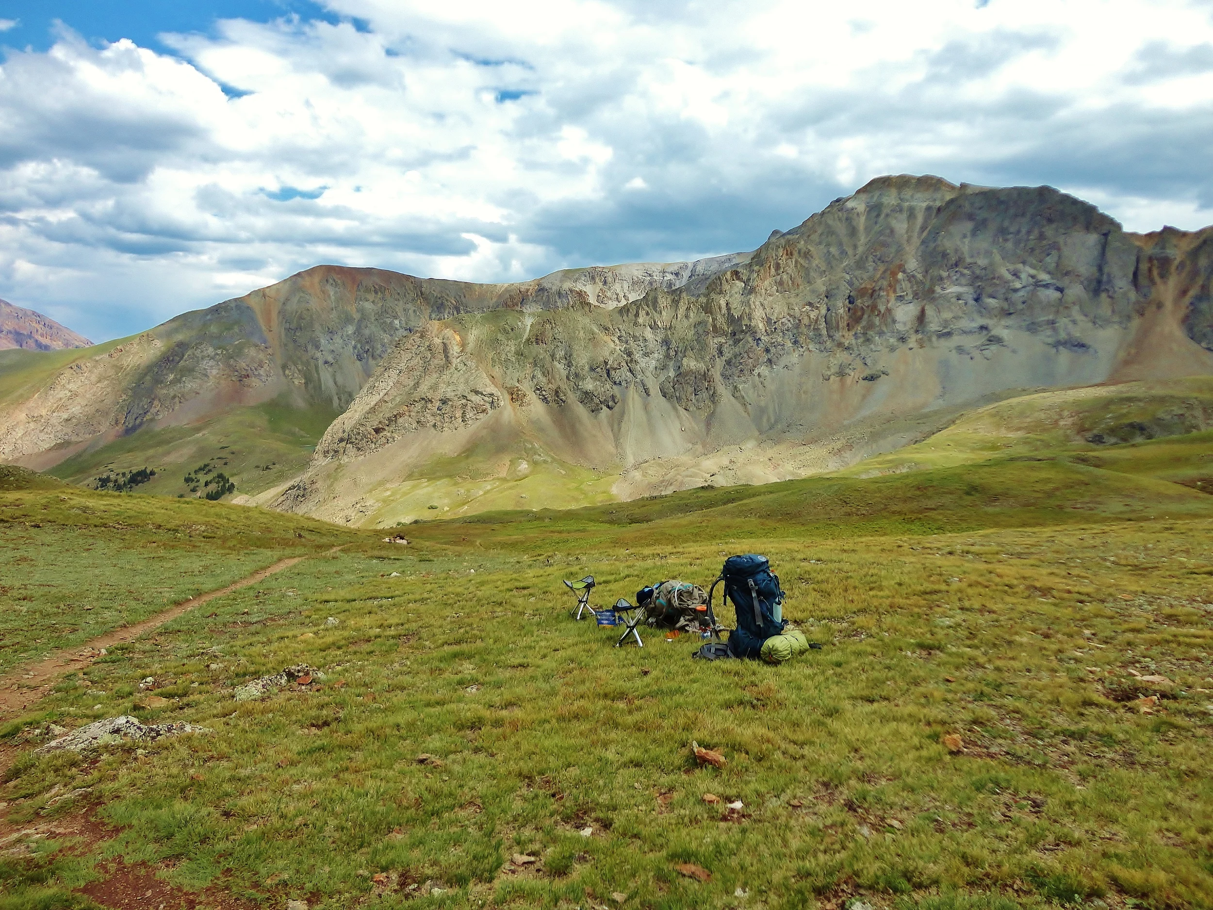 After several hours and many stops for air, we reached the pass. The wind threatened to blow us over, but the views were spectacular! The red iron in the mountains was something I had never seen before; and the contrast with the cloudy blue backdrop of the sky was breathtaking. We were bushed and losing daylight, so we only made it a few hundred feet below the ridge-line before pitching camp. Our campsite was well above 12,000 feet, and we woke the next morning with some altitude headaches. But enjoying our freeze-dried breakfast skillet under a beautiful sunrise over the peaks to our east made it well worth it.
