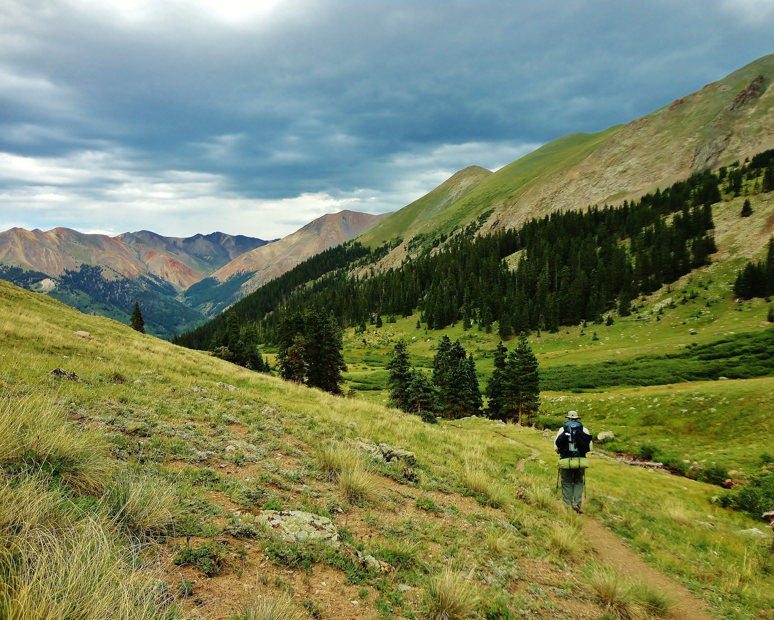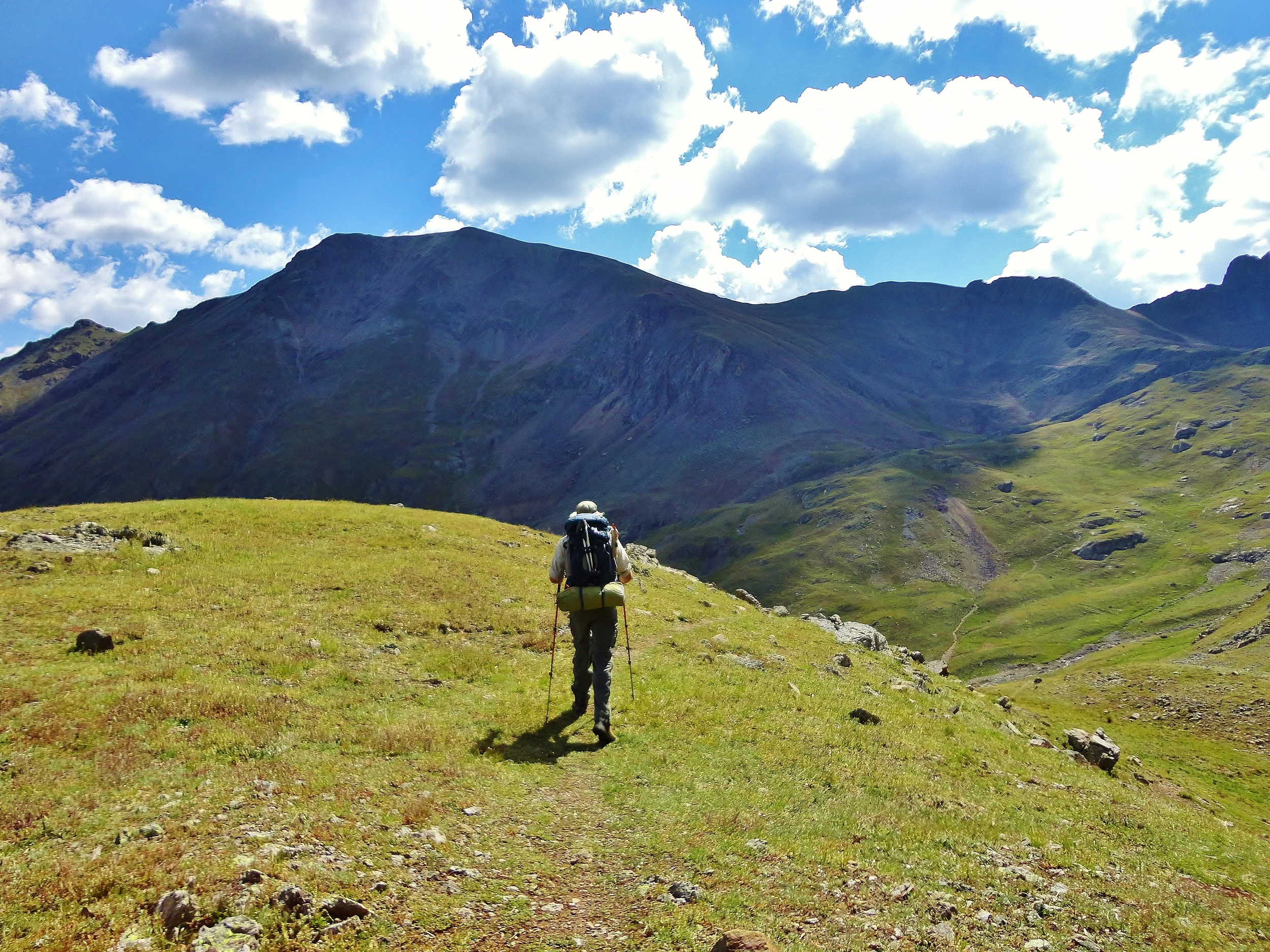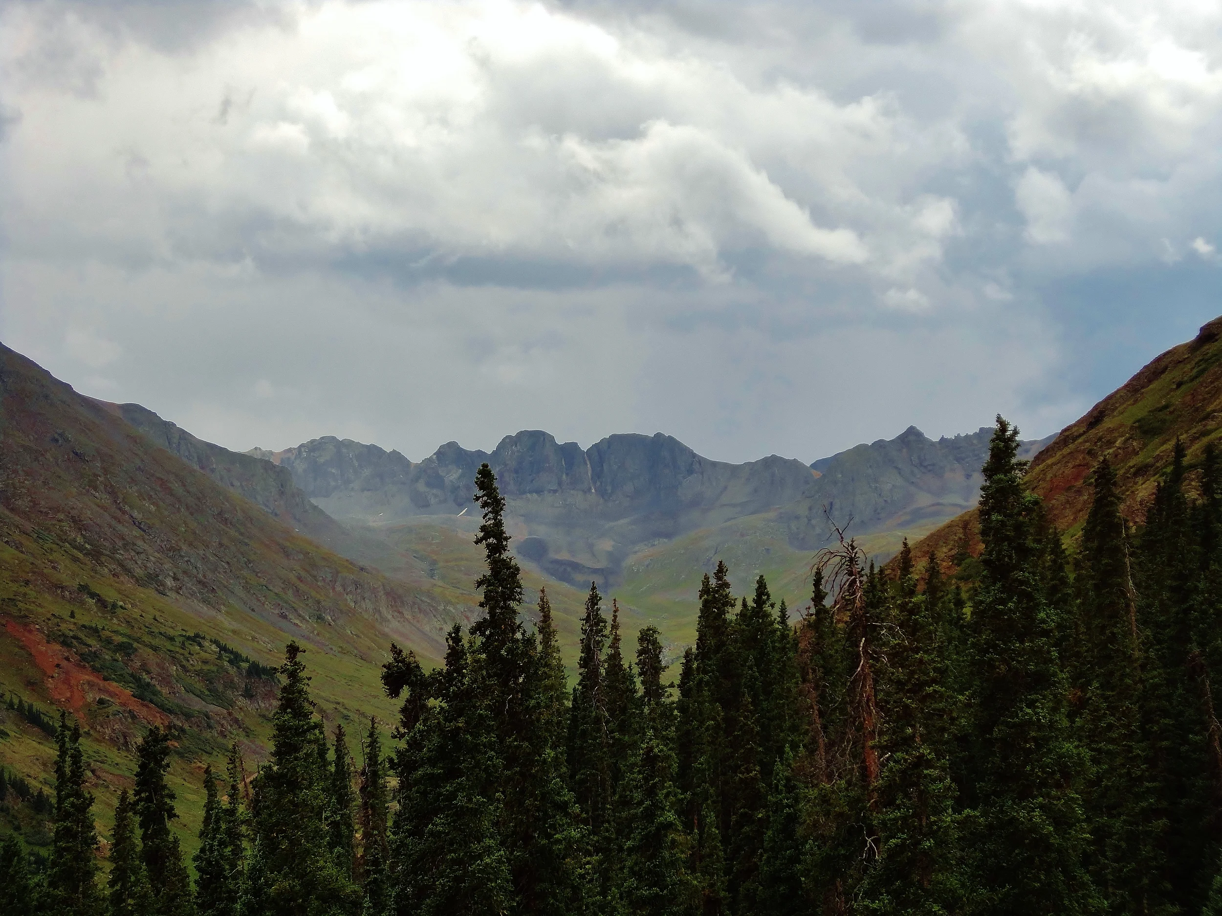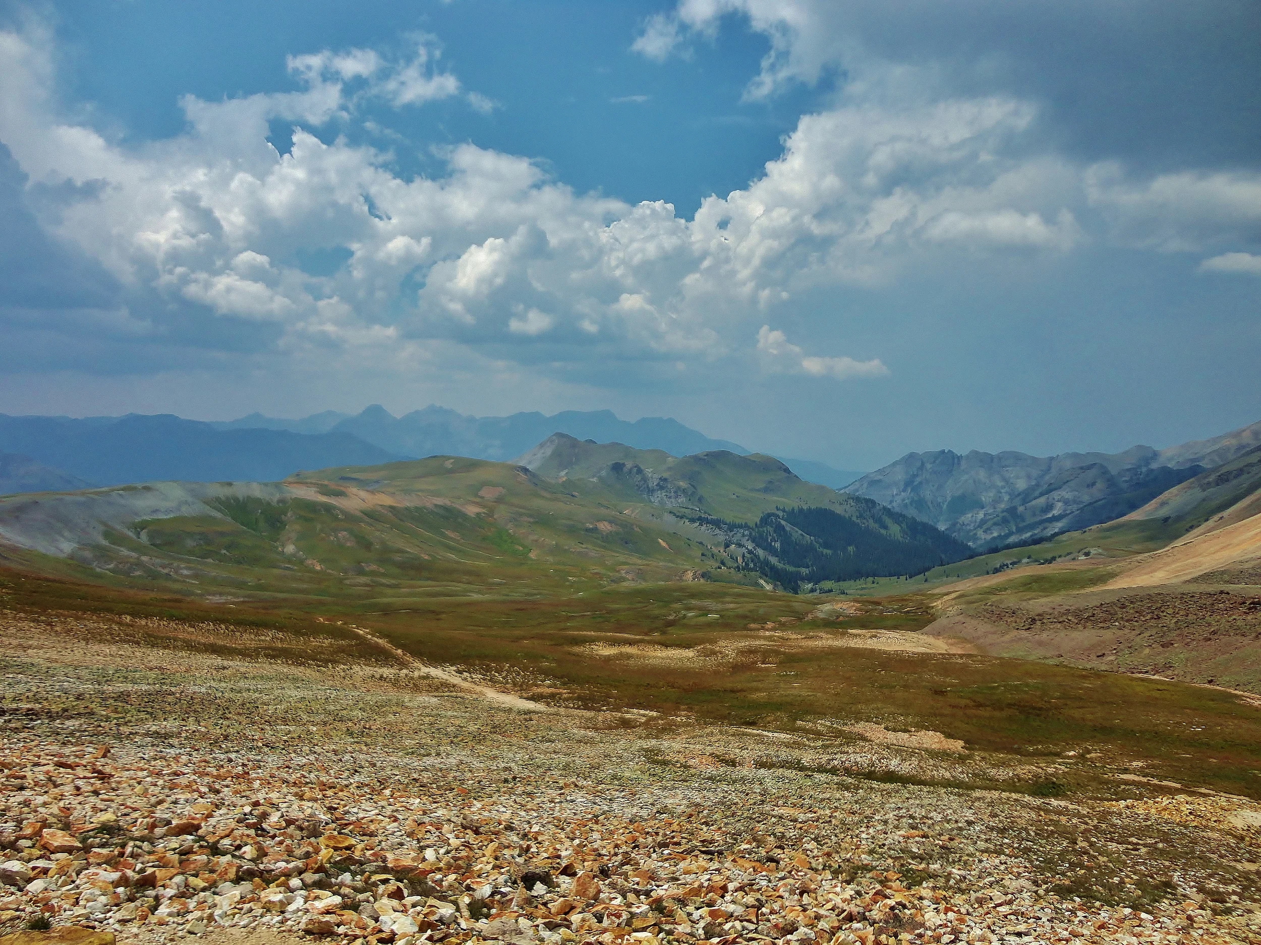 With only enough food for one more day, and over nine miles to get back to our car, we decided to skip Sunshine and Redcloud, and head straight along the Alpine Road, over Cinnamon Pass, back towards the car. The road was easier to hike than the trail -- barely. But let me explain; when I speak of a road, you might conjure in your head perhaps some asphalt, or at least some gravel or dirt someone has attempted to level. The Alpine Road is steep, narrow, and has large boulders jutting from it at frequent intervals. We were passed by ADV bikes, dirt bikes, jeeps, trucks, and the occasional Subaru, but most of the time we had the road to ourselves. Which was fine with us, until the storm rolled in...
