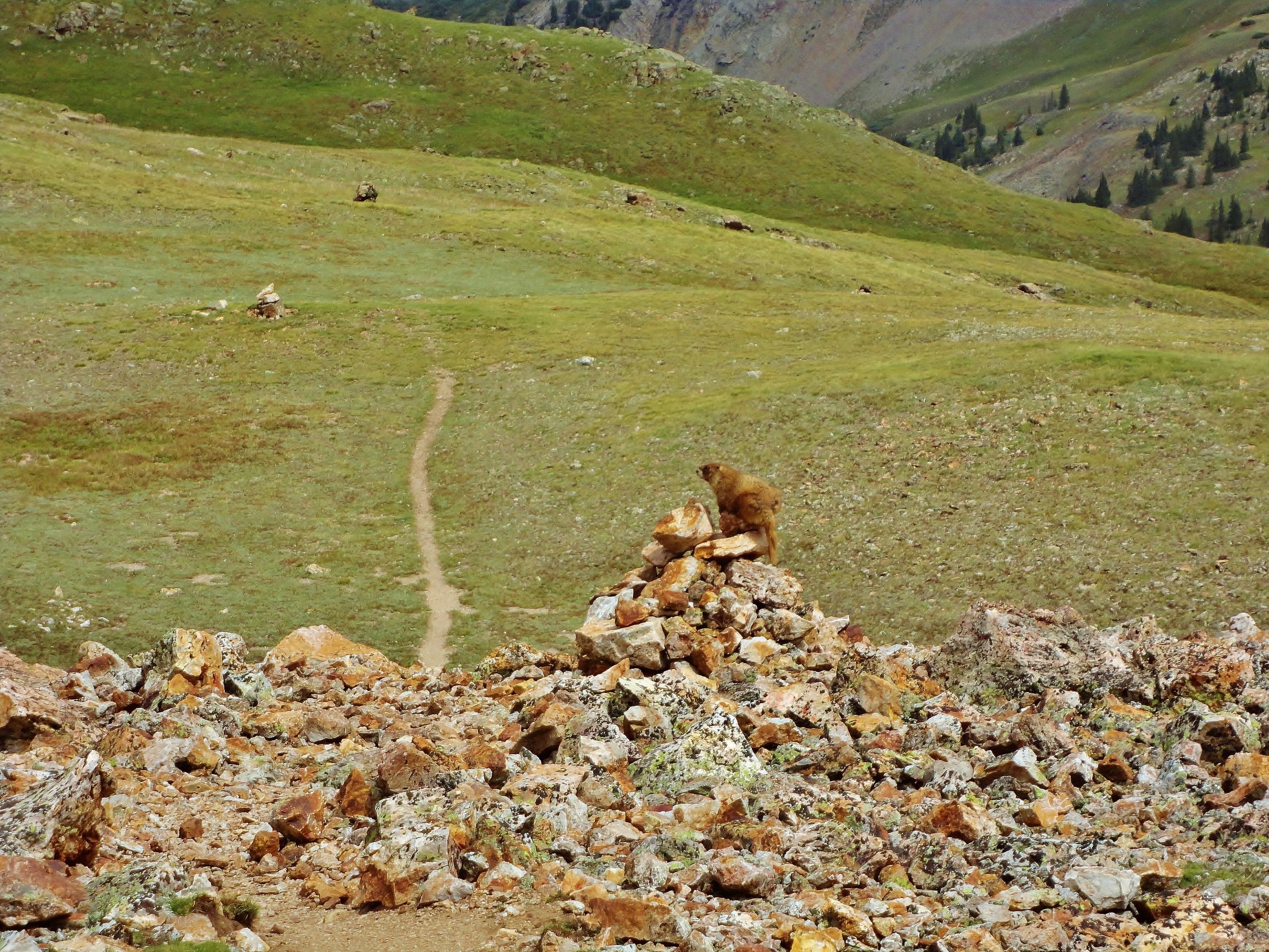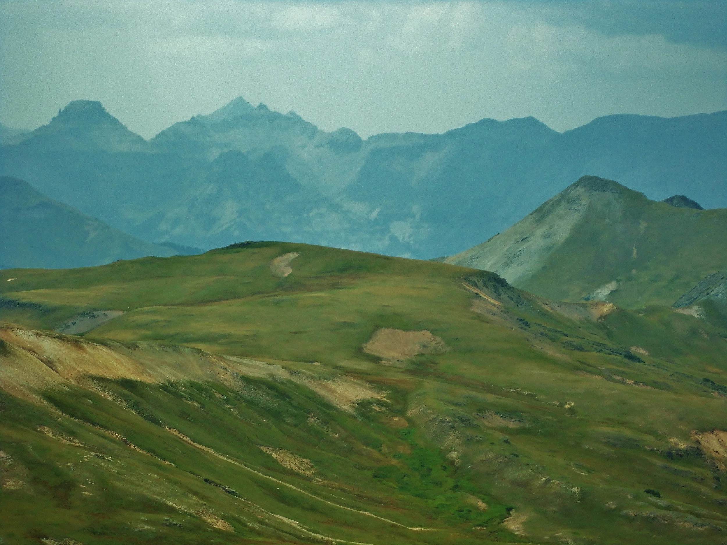 The road went past the north end of American Basin, then switch-backed up over Cinnamon Pass. We were rained on several times. The first couple of times we huddled under the tent rain fly, receiving several strange glances from passing ATV-ers, but after a while we numbed ourselves to the torrential downpour and just trudged onward. We sure know how to have fun! Really! It was! And it was just as pretty to see the clouds rolling over the peaks, even through the occasional clap of thunder that told us we better hurry and get our butts off the mountain, as it was to see them under sunshine.