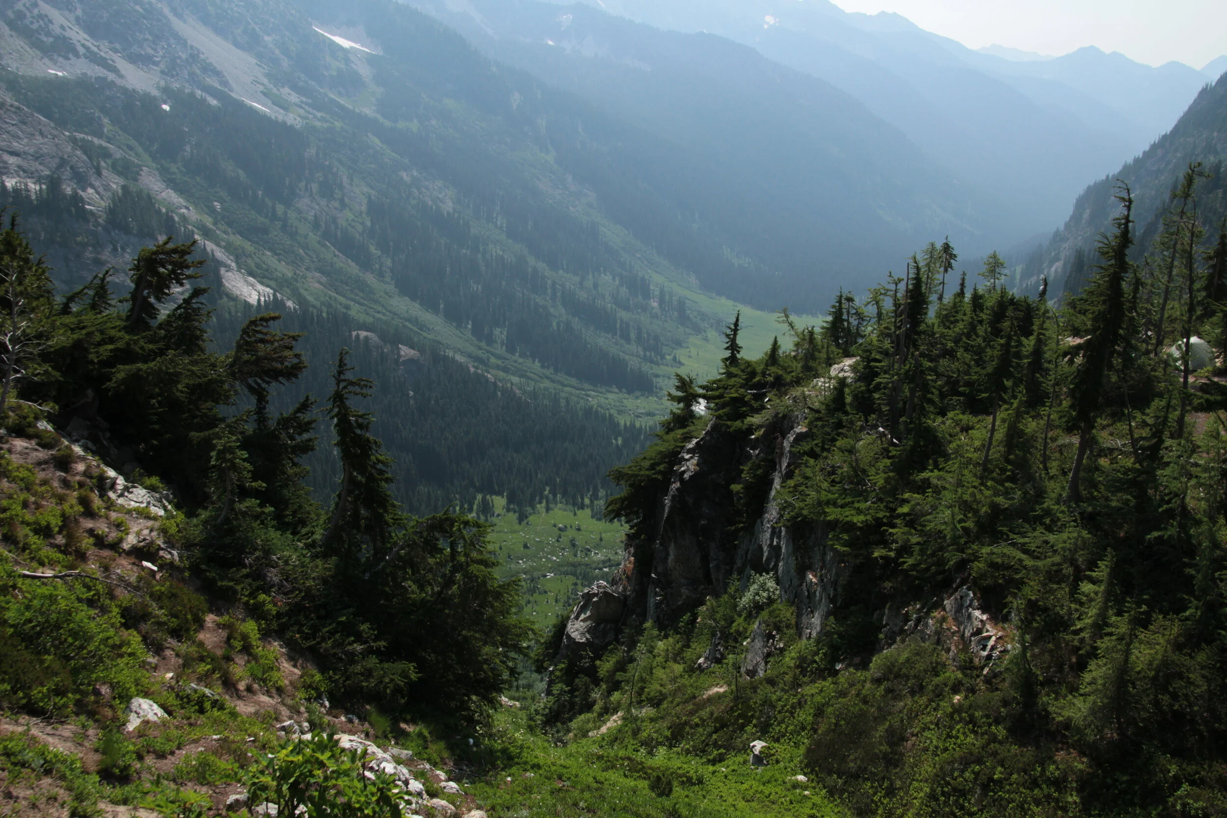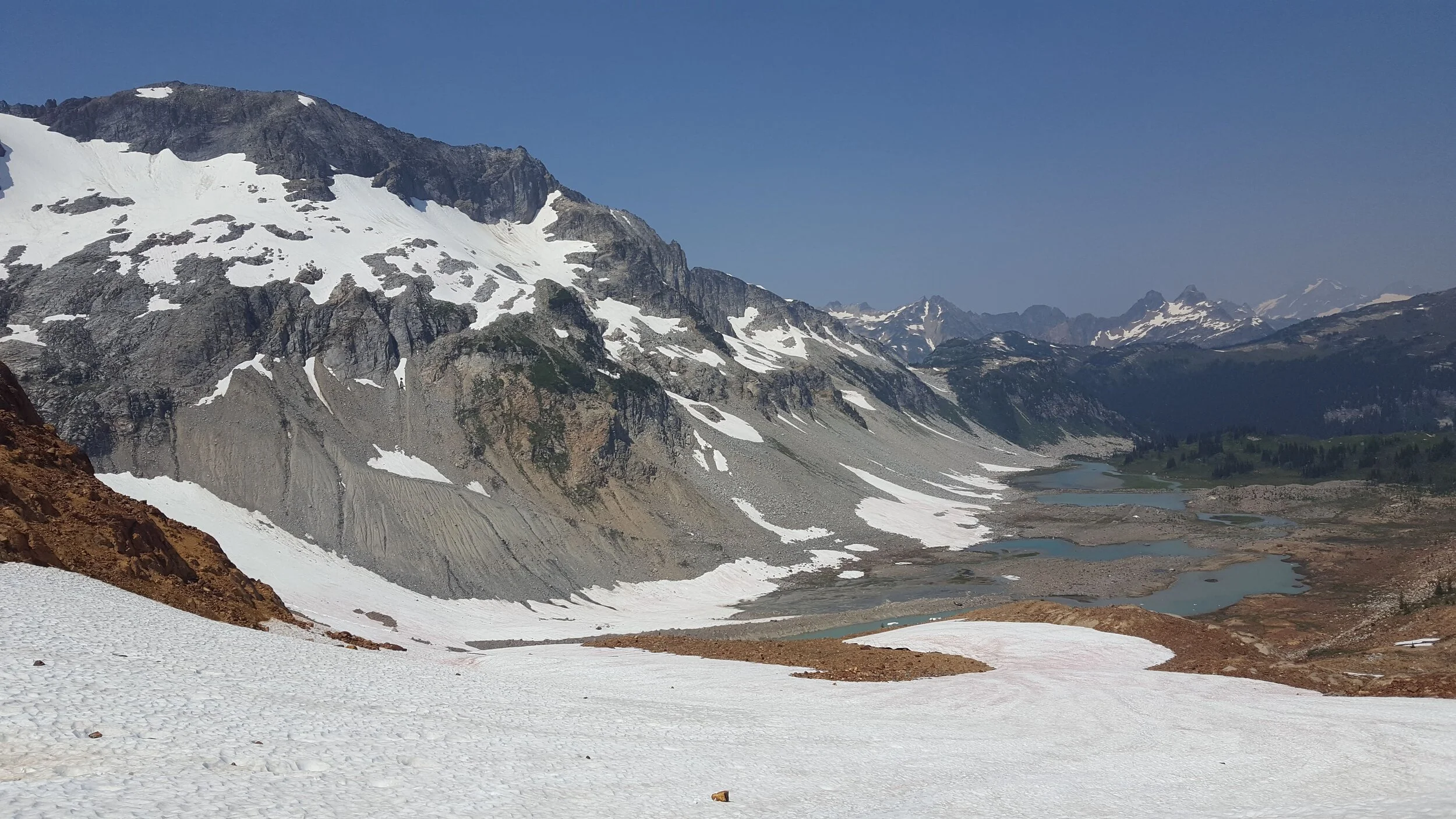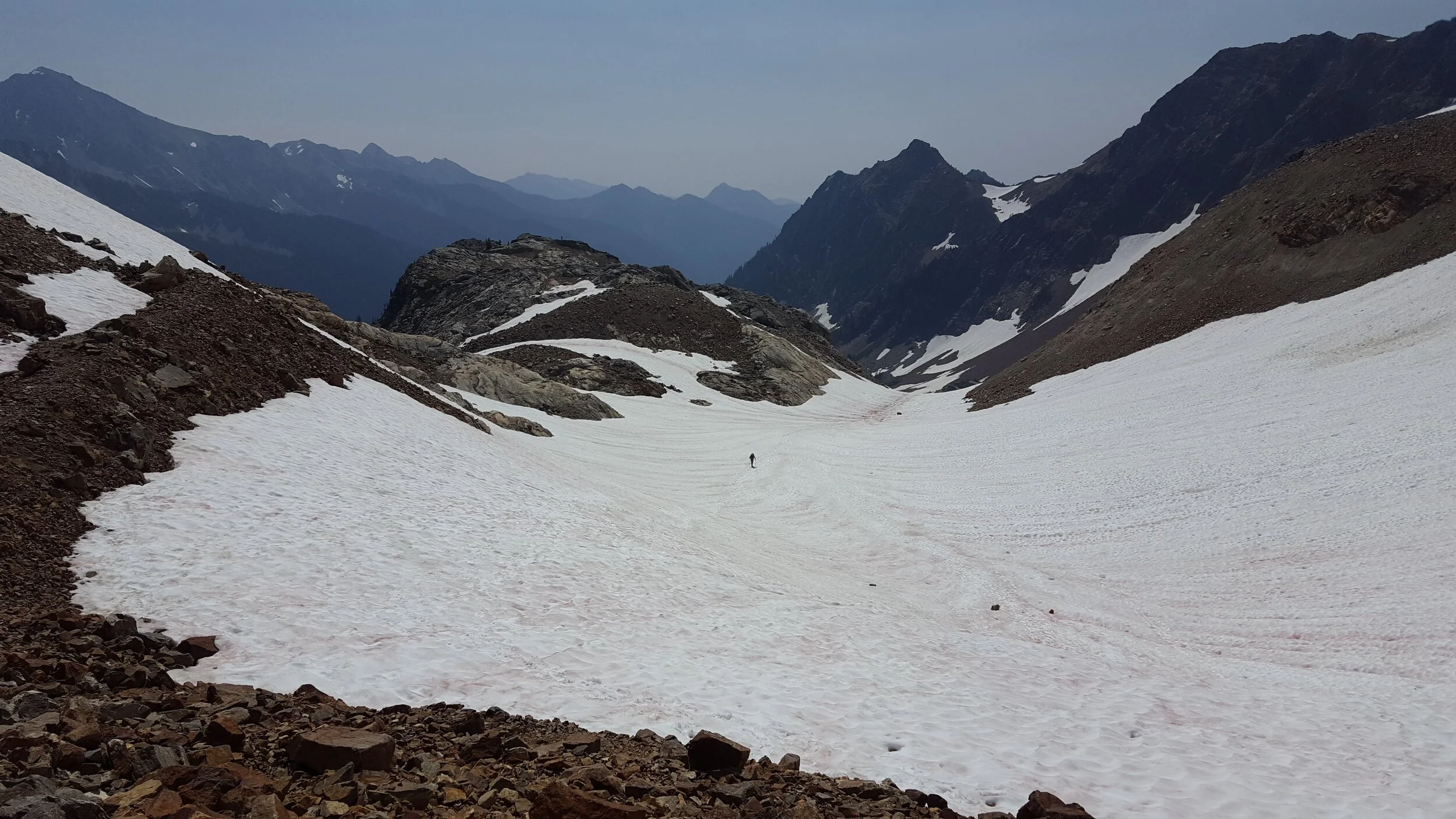 The next day had us doing a grueling climb up and over Spider Glacier and Spider Gap, down to Lyman Lake, and then up toward Cloudy Pass. On the NatGeo topo, the trail doesn’t go over Spider Gap, but thanks to the good folks at the Washington Trails Association, we knew you could walk up the glacier and over the pass. Sarah of course cruised right up the glacier while I dragged ass, but I made it. It was truly stunning, even though some fires in the state made things rather hazy. Oh, and there were more bugs. Have I mentioned the bugs?