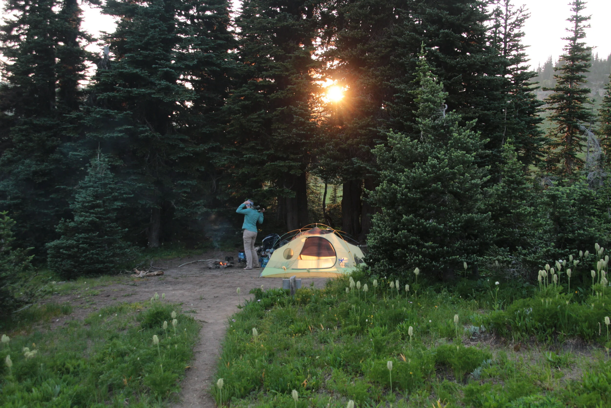 We would have loved to have hung out at the lake, but the skeeters and flies had other plans. We pressed on up almost to Cloudy Pass, and found a meadow to camp in. Again, a fire was needed to keep the bugs at bay.