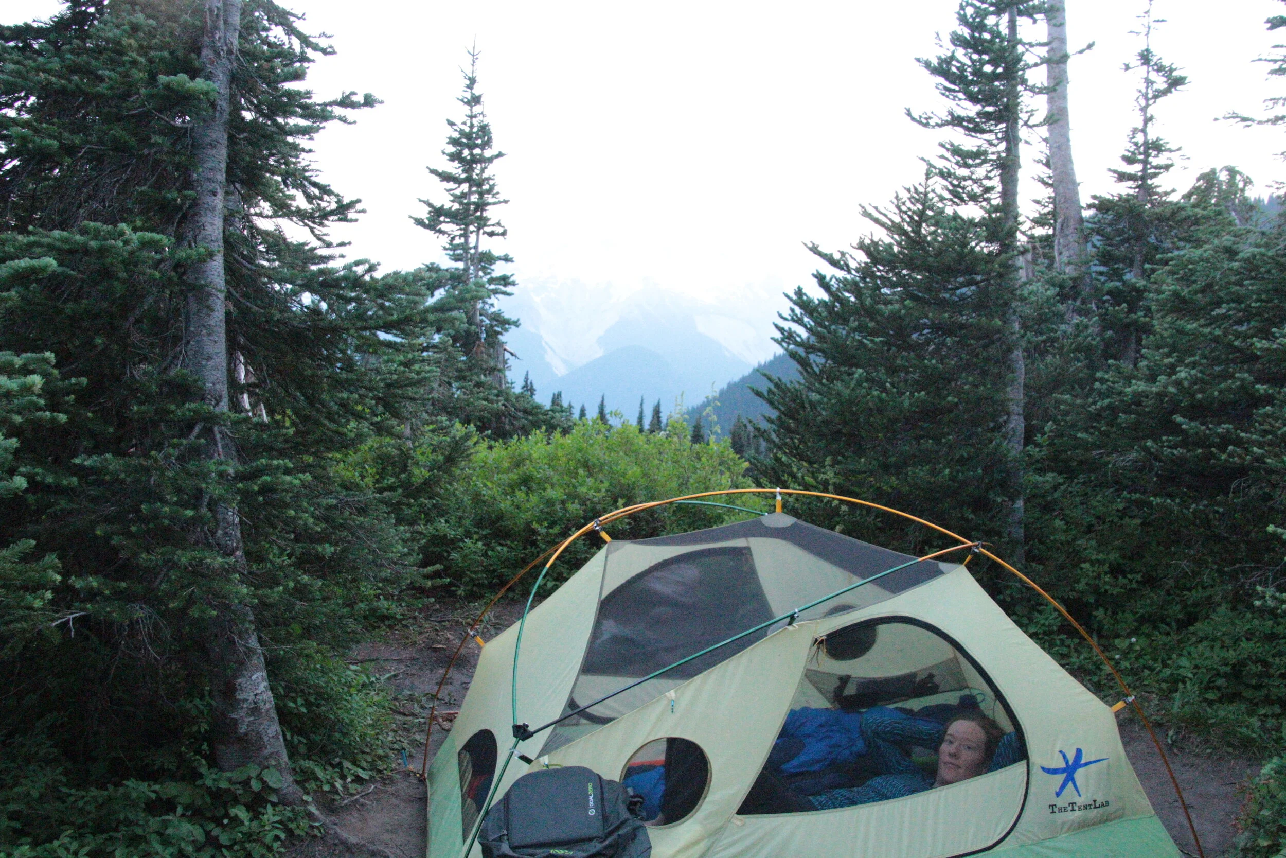 The next day we met up briefly with the PCT, then turned down Buck Creek Trail. This was the day we’d get to see the namesake of the whole wilderness area, Glacier Peak. It’s one of the tallest peaks in the Cascades, and true to its name, is flanked on all sides with them. We set up camp near Flower Dome, with a great view of it.