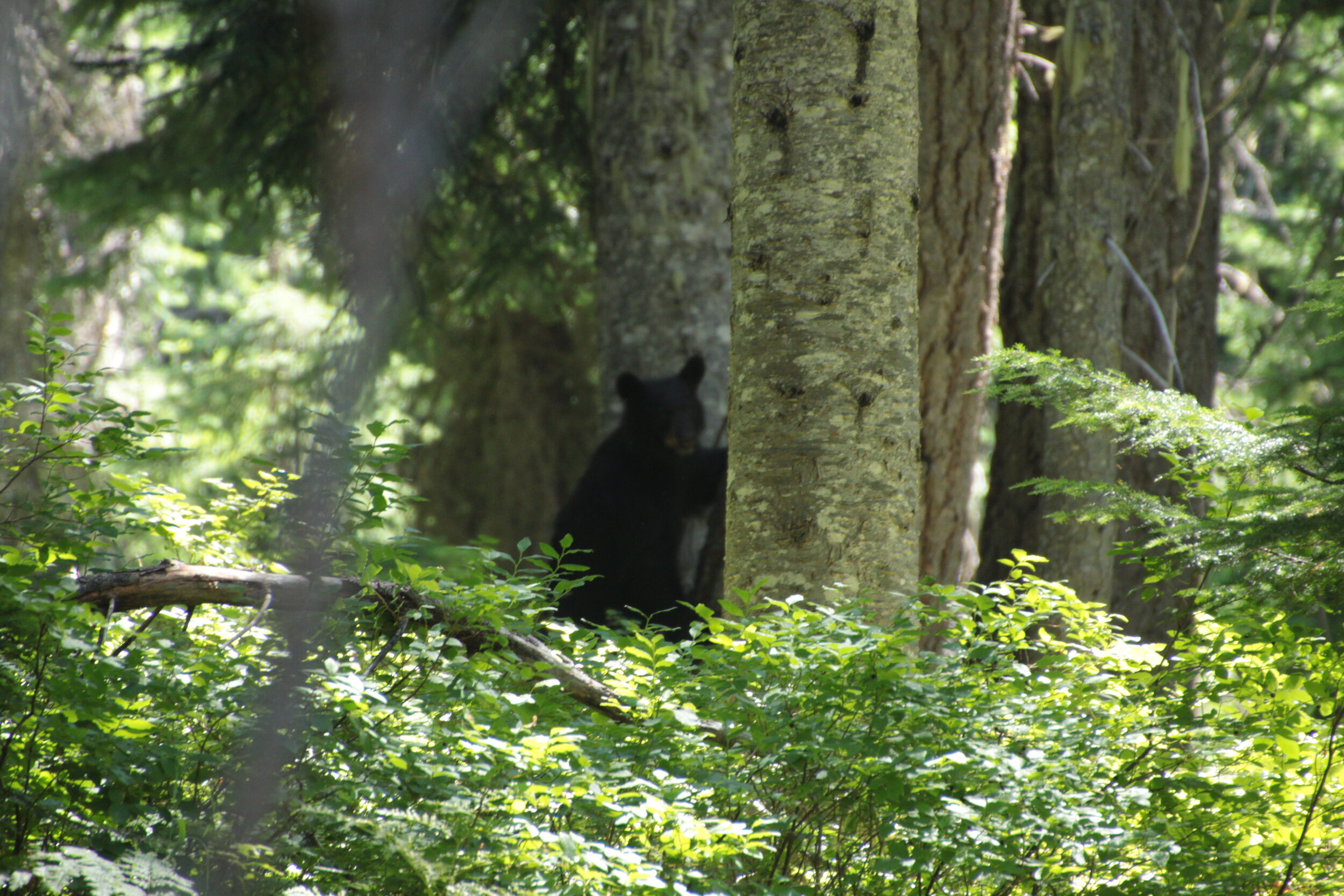 One of the most memorable parts of the hike, and one of my biggest failures as a photographer, happened about an hour out from the trailhead. We inadvertently startled a black bear and her two cubs, about 100 feet to our left, and momma bear immediately sent her cubs up a tree, while she stayed down and eyeballed us keenly. We stayed still, except for me fumbling to get my camera out and off manual focus (I had been trying to get a photo of a spider web earlier). By the time I remembered I had put it on manual focus, momma was recalling her cubs dirtside and escorting them away from us.