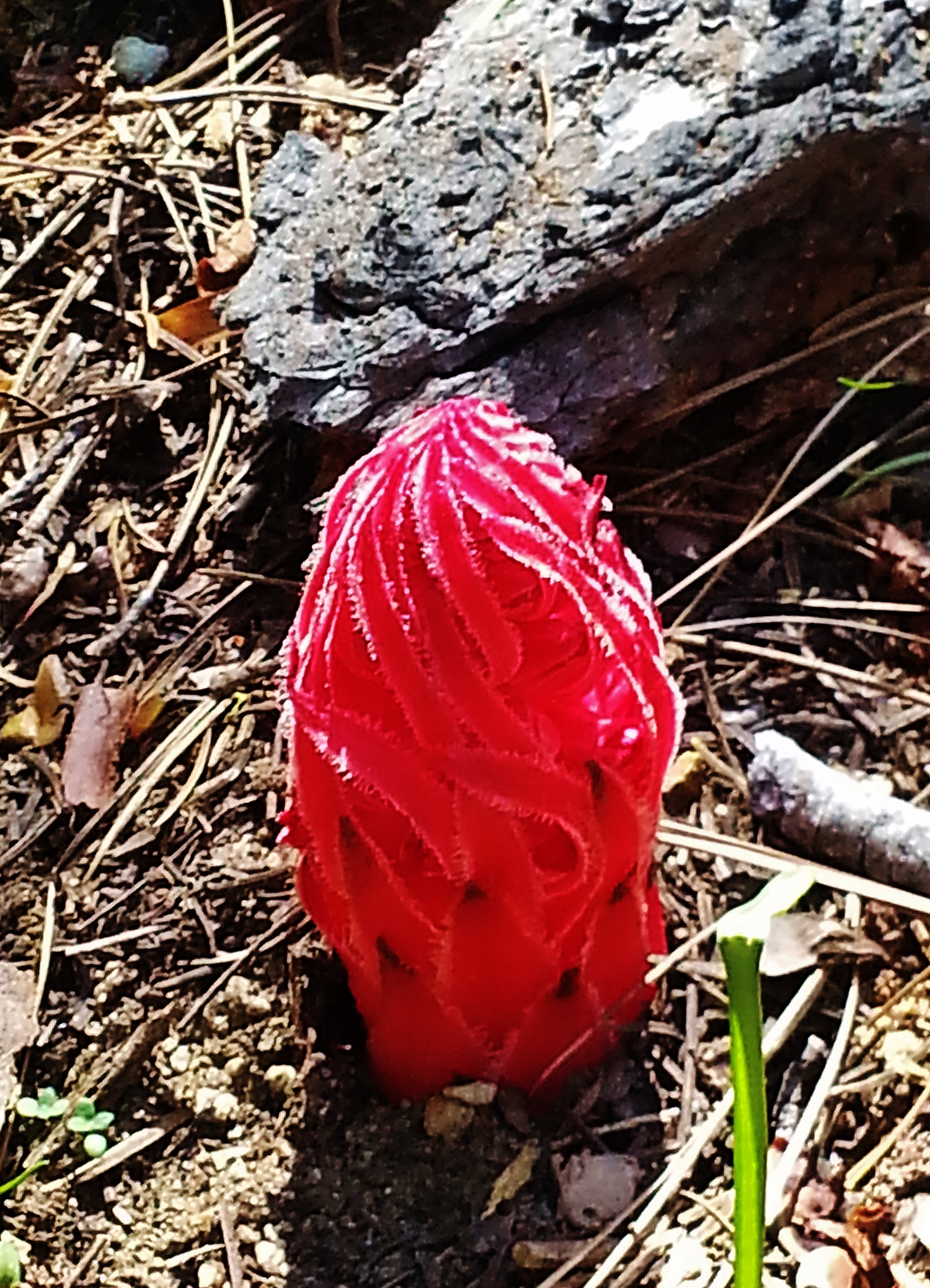 We started seeing these at higher elevations. They are called snow plants, and interestingly enough don't have chlorophyll, instead getting nutrition from fungi under the ground.