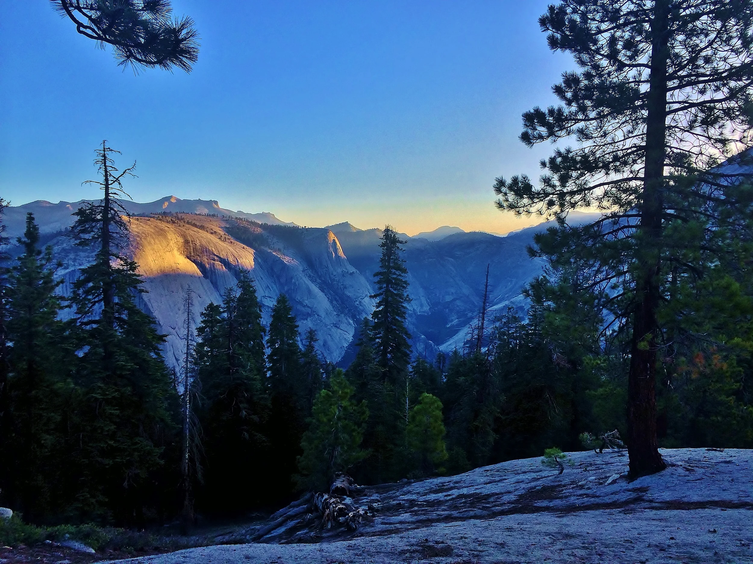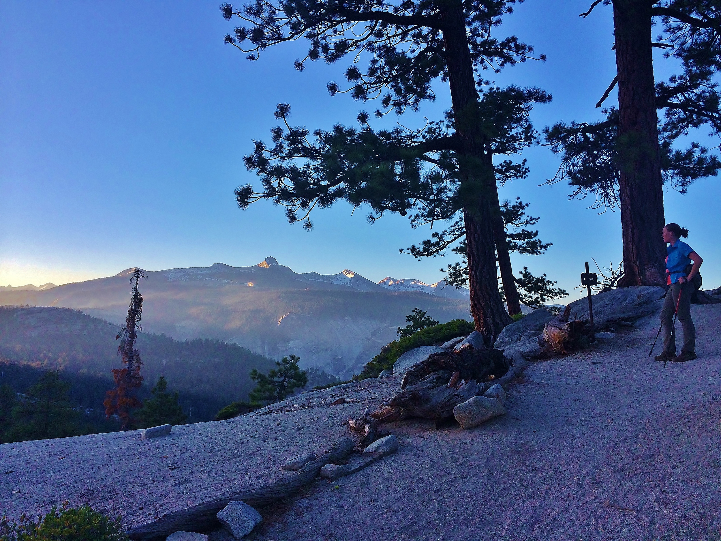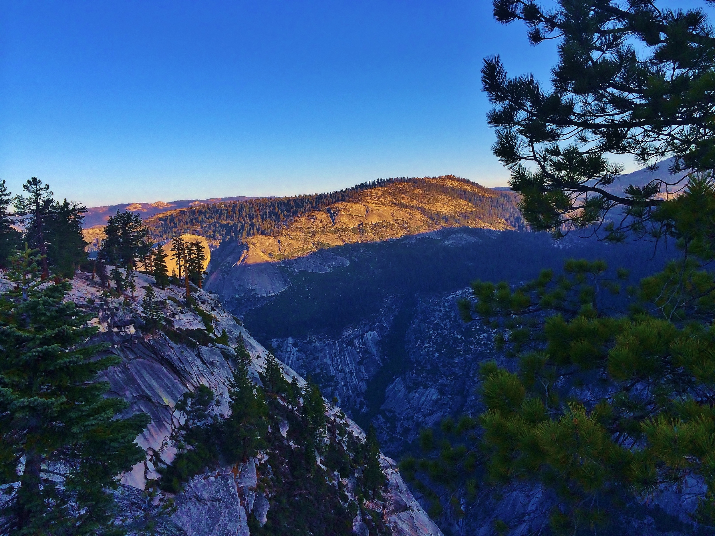 We got on the trail by 5am, just as the sky was starting to lighten. We made it a couple thousand feet up to the steep part of the Half Dome climb just as the sun was breaking the horizon. It made for some great photos of the surrounding mountains!