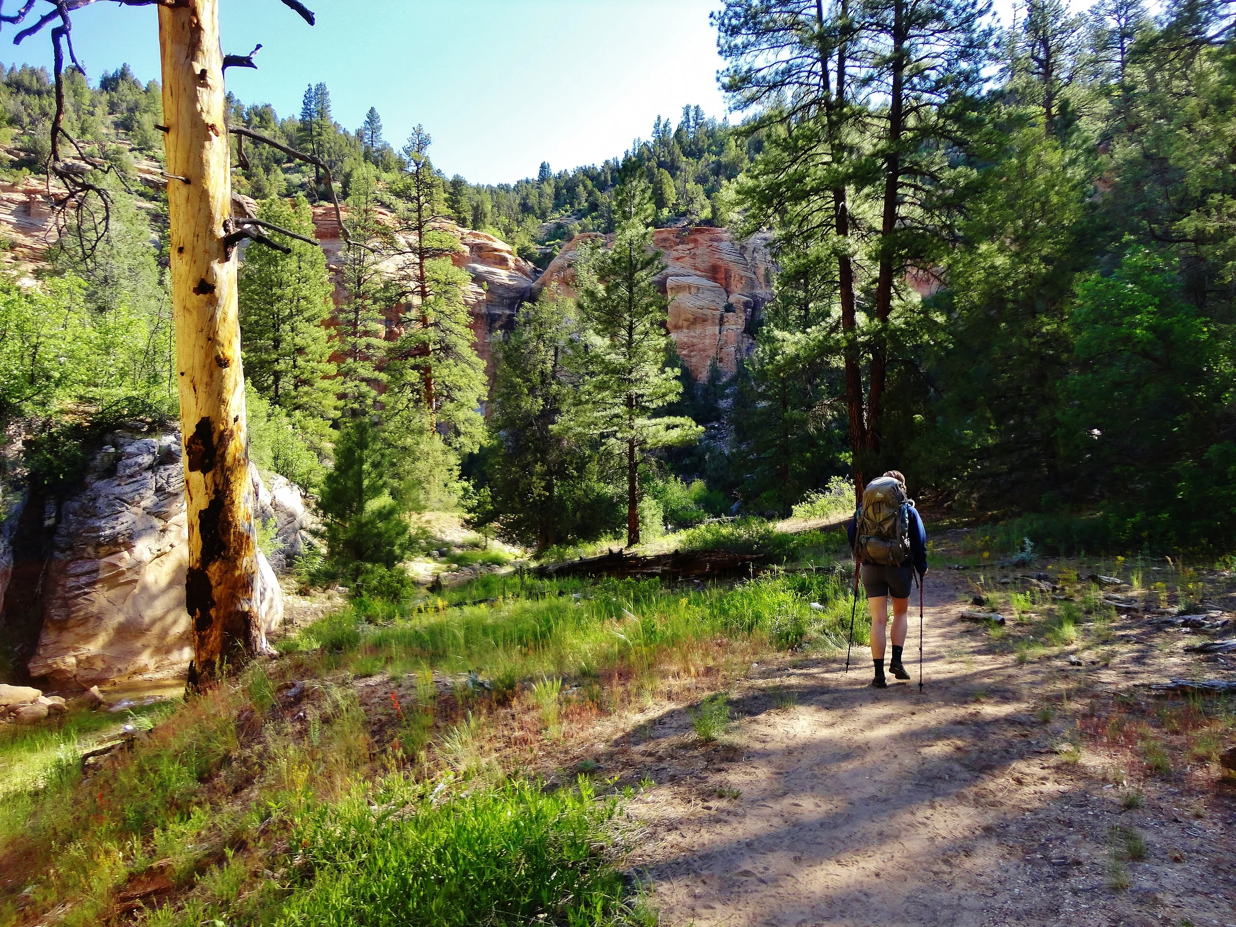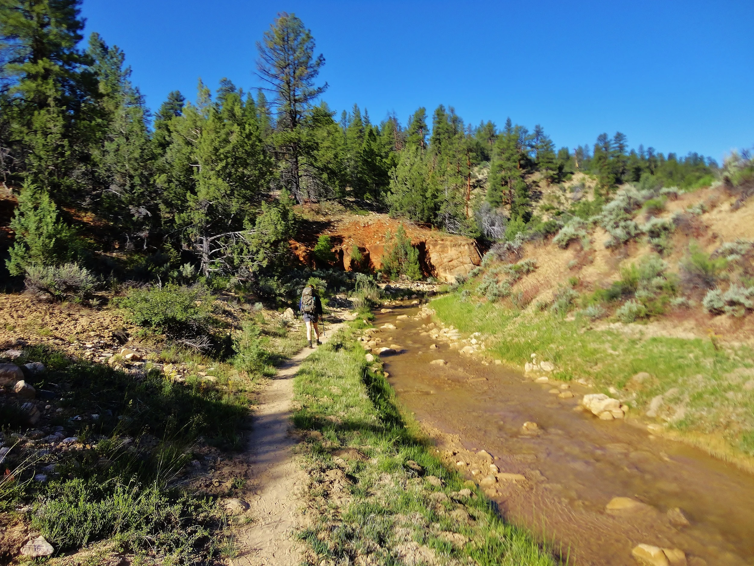 The trail started out in a meadow valley, and gradually sloped down toward the canyon. We followed a small stream that would gradually expand into the Zion River.