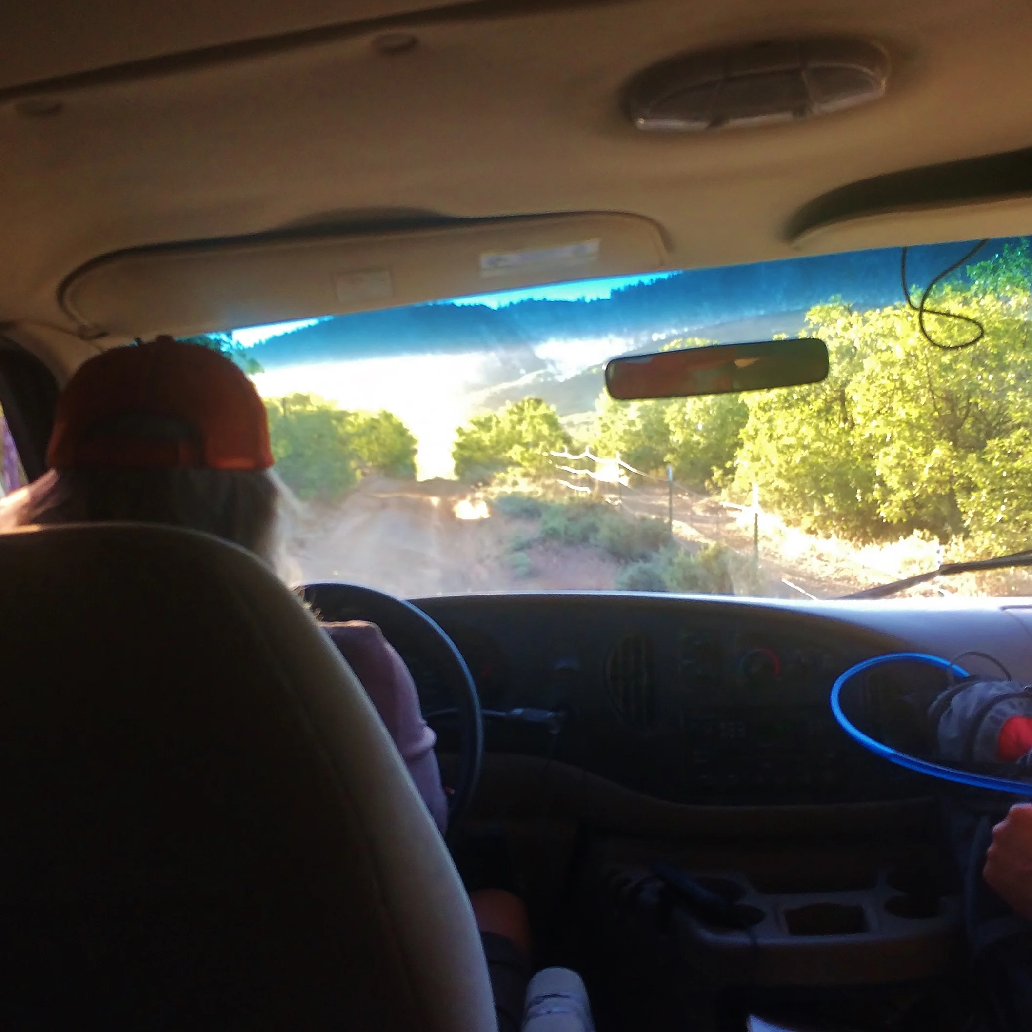 To see the whole Narrows, you have to start at the top, and to do that, you need to arrange a ride. At 0500, we met at the Zion Adventure Company for the shuttle to Chamberlain's Ranch. The van was driven by an aged hippie who seemed intent on impressing us with the speed with which he could traverse the rough dirt roads in a modified 15-pack van, while recounting several tales in which he almost slid off cliffs during incliment weather. Fortunatly, the weather was good, and we survived.